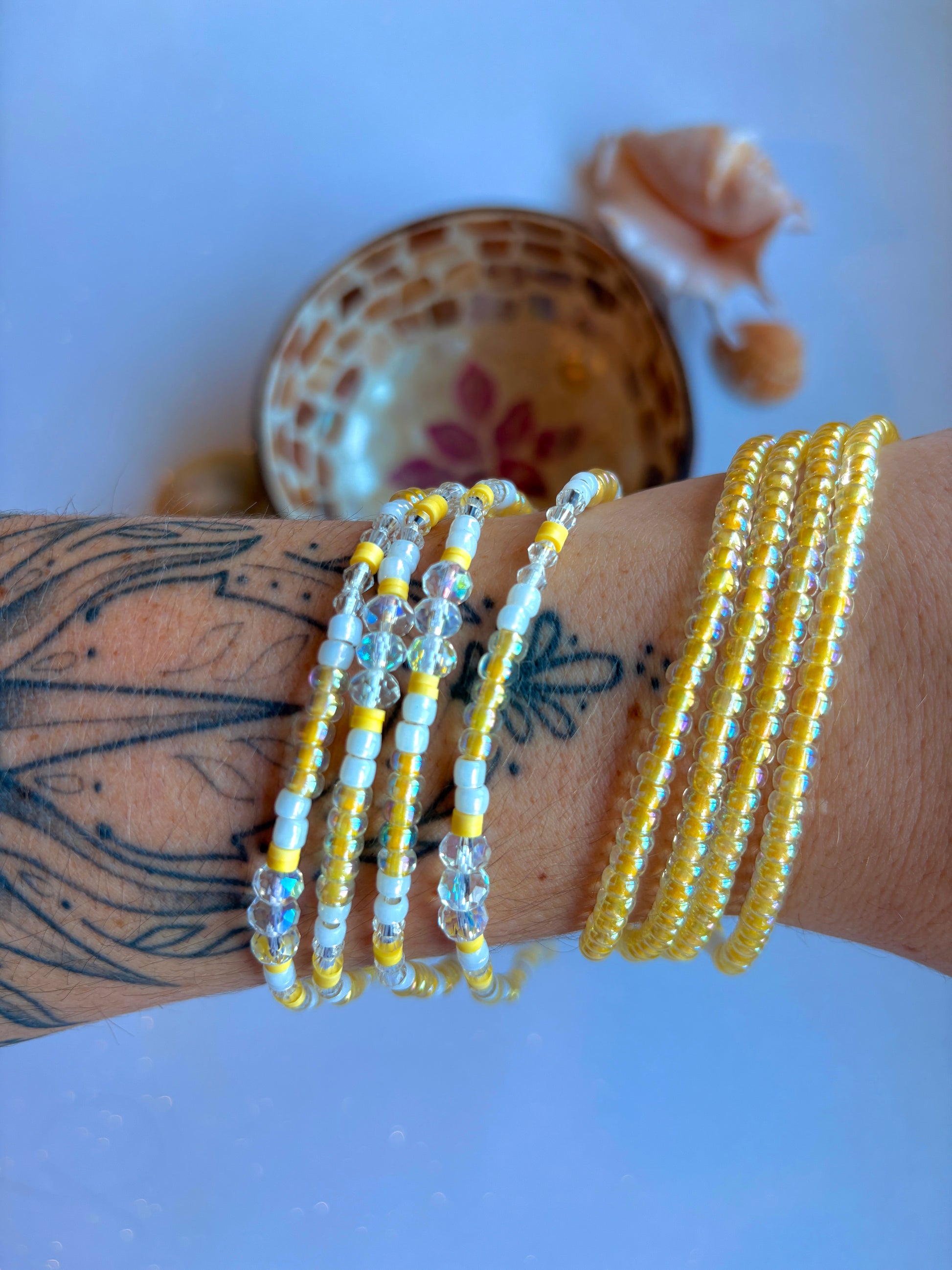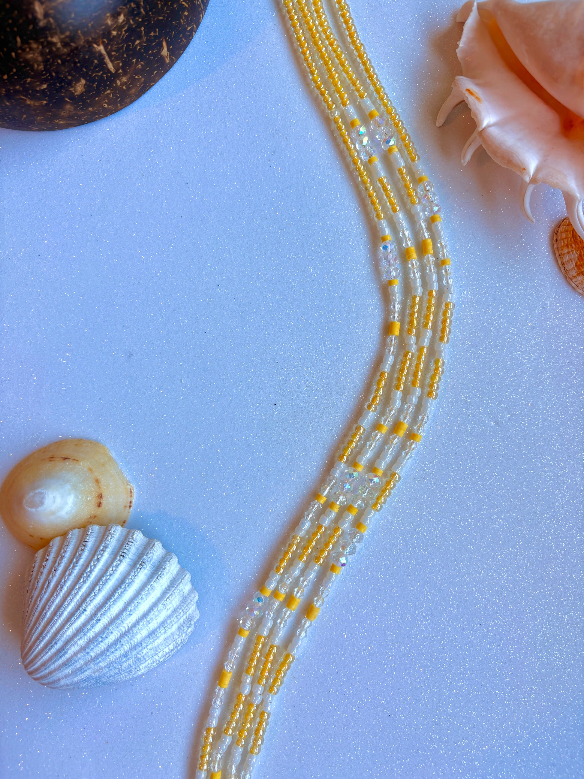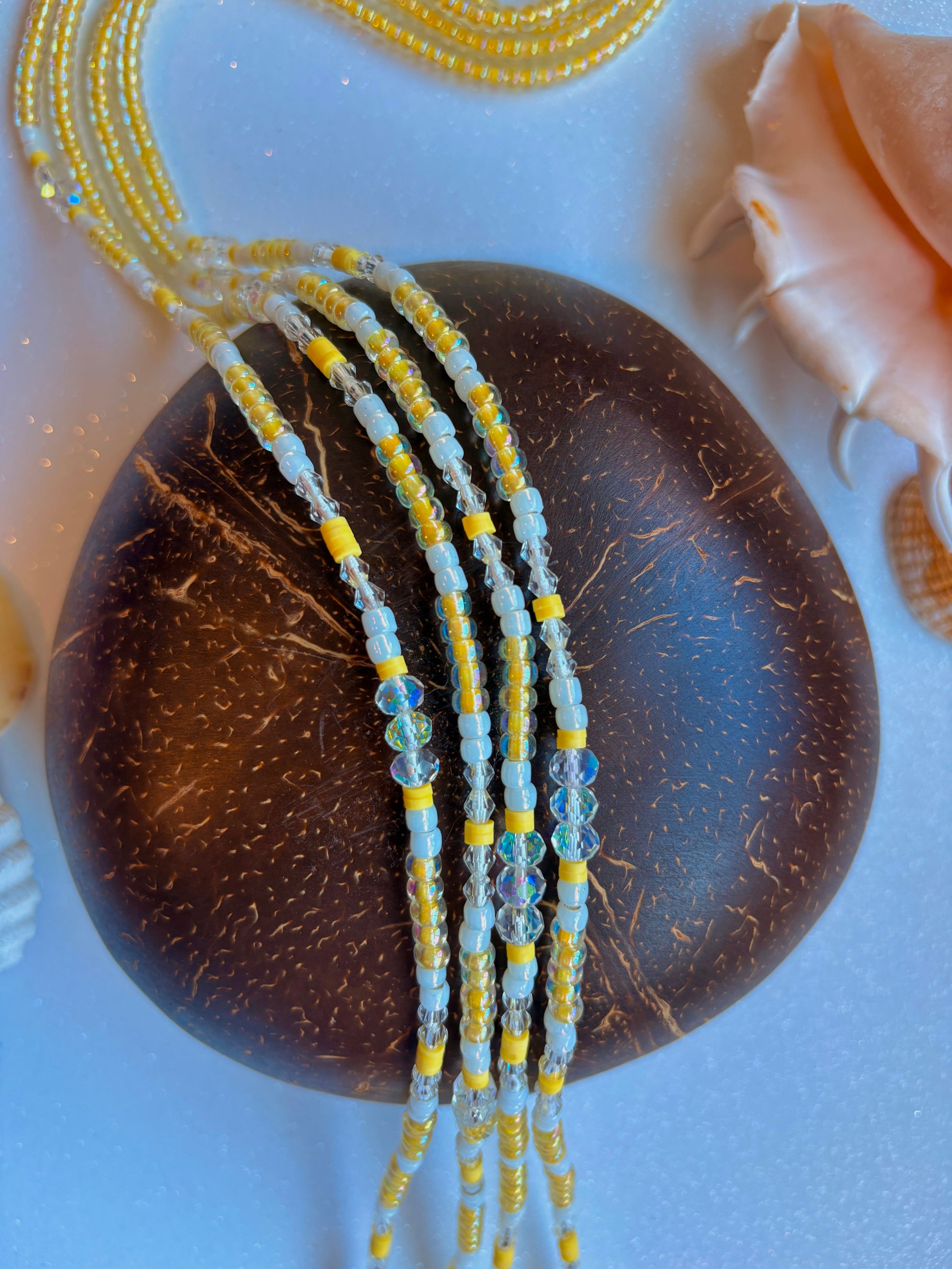 The Daisy Chain waist beads dance with cheerful yellows, soft whites, and iridescent clear crystals that shimmer with every move. Inspired by daisy fields, warm laughs, and days that feel light, this strand is all about joy, playfulness, and embracing your inner sunshine. Wear it as a reminder not to take life too seriously and to let yourself glow.