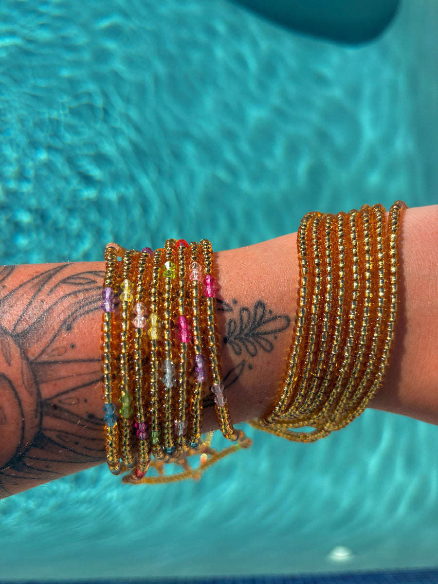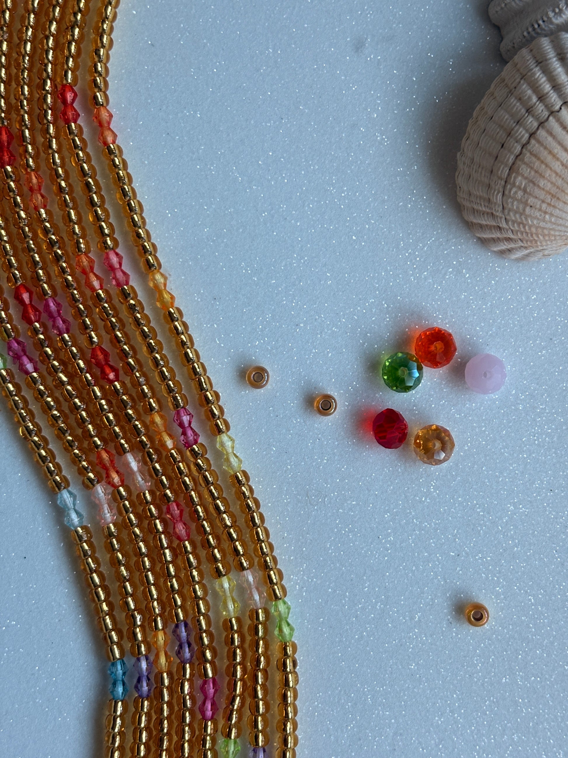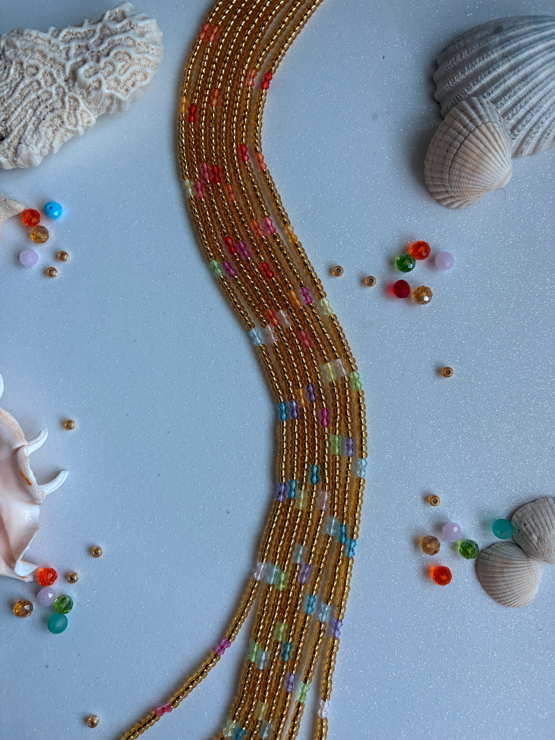 The Goddess waist beads glisten in gold, accented with tiny multicolored gems — each bead a celebration of abundance and divine feminine energy. Wear them as a reminder of your light, your strength, and your infinite beauty.