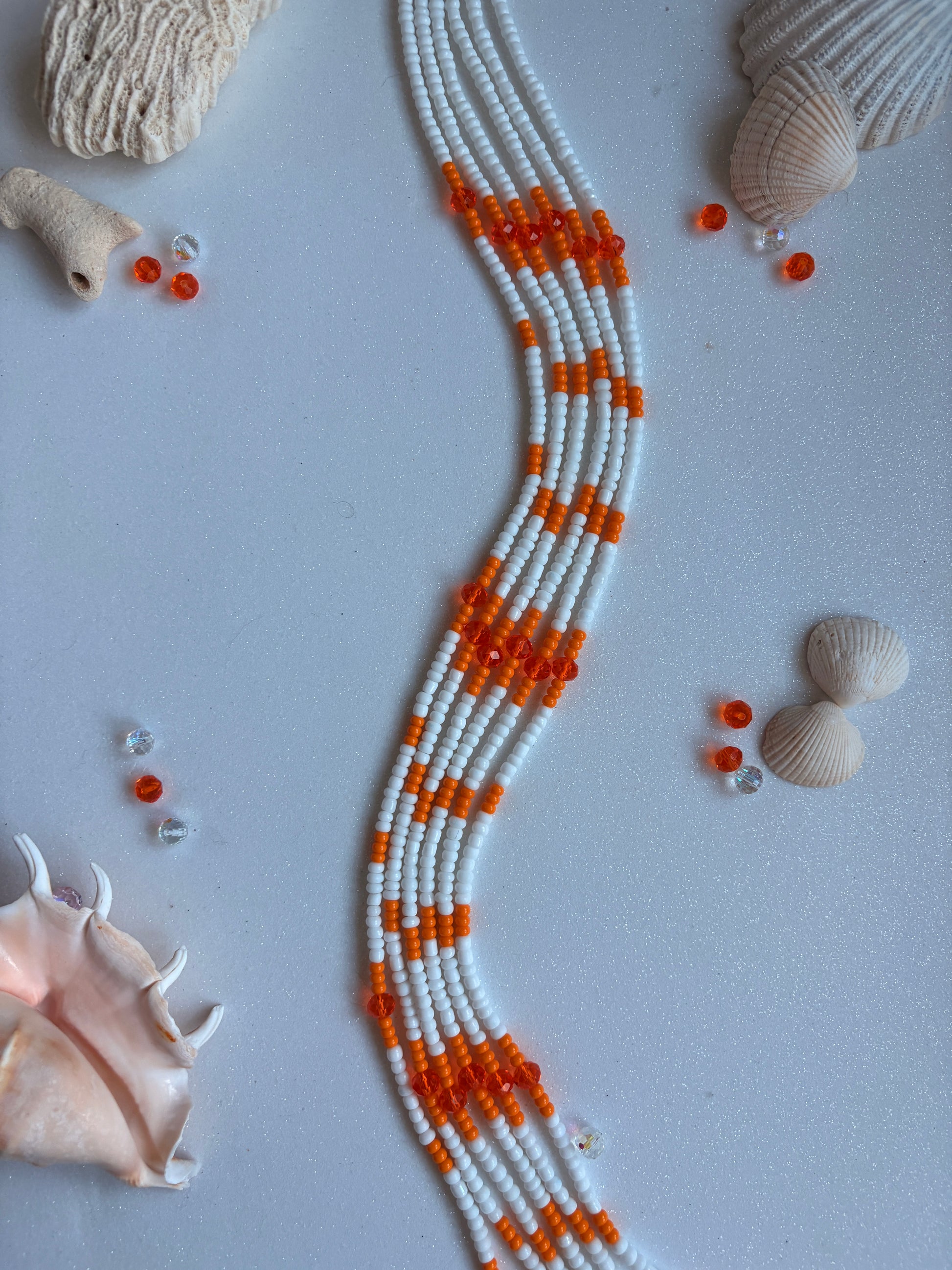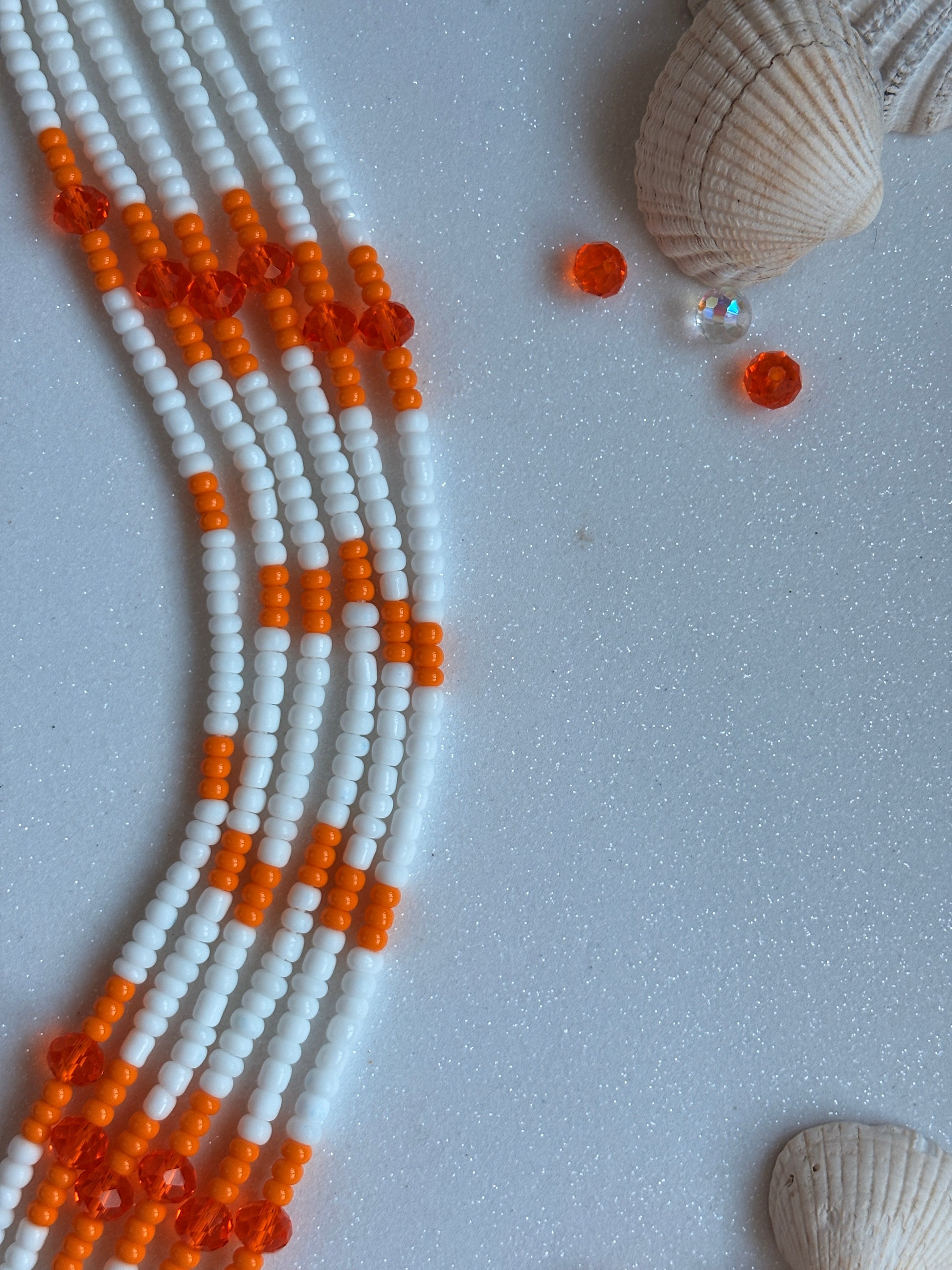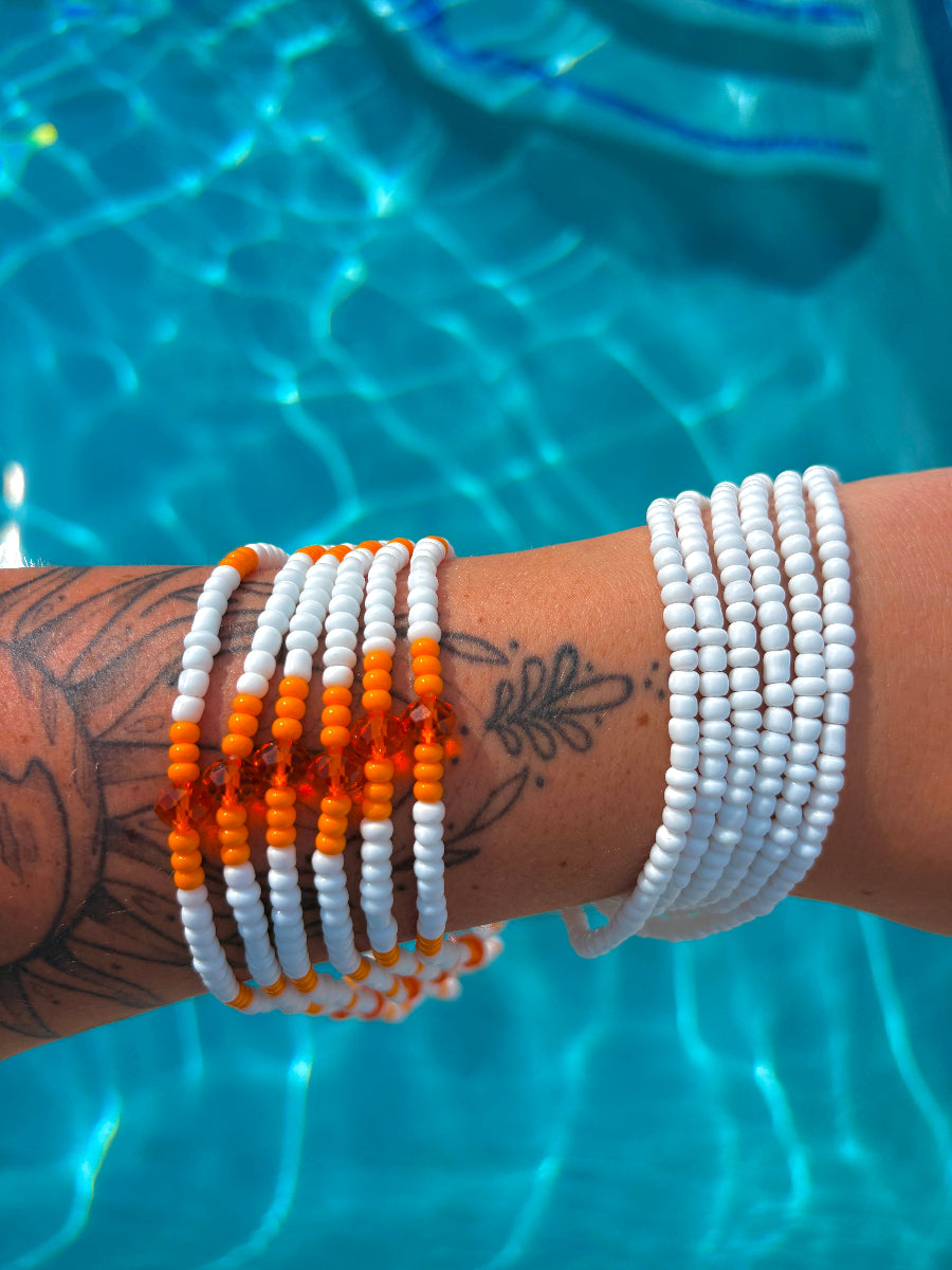 The Mango Sorbet waist beads combine juicy orange and crisp white — a sunny, uplifting blend that radiates warmth and energy. Perfect for those who bring light wherever they go.